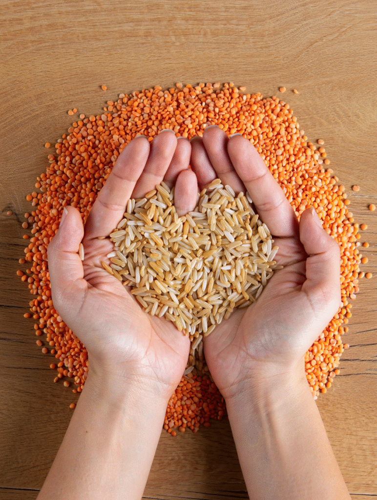 Two hands forming a heart shape using grains and lentils on a wooden surface, symbolizing compassion and community support.