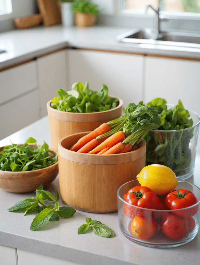 A clean minimal kitchen setup with neatly arranged fresh produce in reusable containers, eco-friendly bowls, and green leaves symbolizing sustainability.