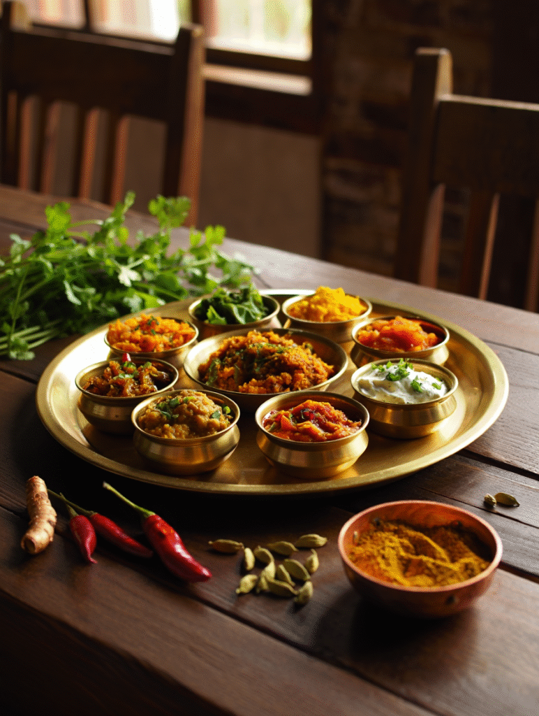 A rustic wooden table with neatly plated traditional Indian thali, fresh vegetables, herbs, and spices placed around, warm natural lighting.